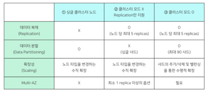- 클러스터 모드는 위 테이블에서 볼 수 있듯이 샤드를 이용한 수평 확장(scaling)이 가장 큰 특징임. 이를 이용해 최대 90개 샤드에서 100TB 용량의 큰 데이터 규모로 스케일 확장이 가능함. 이는 새로운 서비스의 워크 로드의 저장 용량 산정이 어려울 경우에 대한 대비도 가능함.